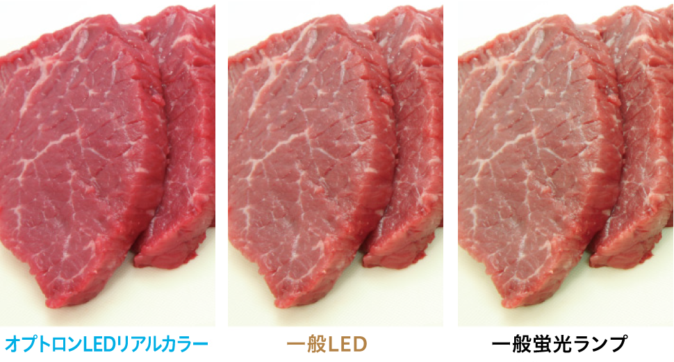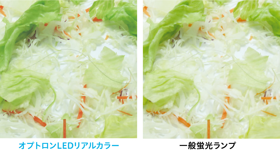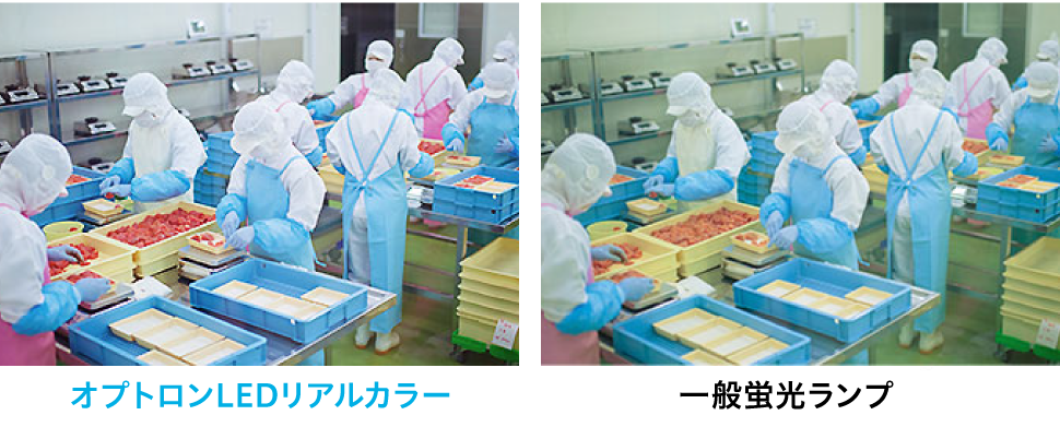 食品や医薬品、精密機器などの生産ラインでは、異物の発見・衛生品質管理のために、製造物の正しい色を再現できる波長と明るさを持つ光源が大切です。太陽光に近い自然な色を再現でき、快適な明るさを得られるオプトロンLEDリアルカラーは、製造現場ラインのために生まれた照明器です。