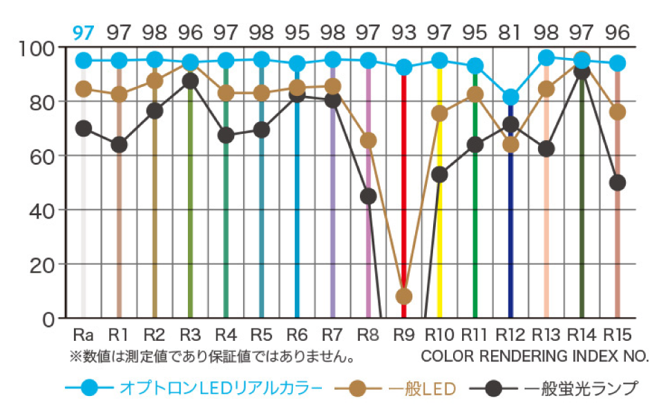 ※演色性:太陽光のもとで見たR1〜R15の試験色を基準として、評価する光源がどの程度色を再現できるかを数値化したもの。数値が100に近いほど色が自然に見えます。