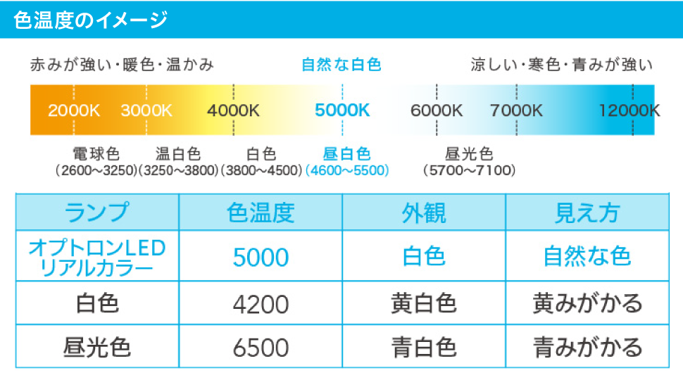 ※色温度とは光源が放つ光の色を数値で表したもので、5000Kはもっとも太陽光に近い数値です。