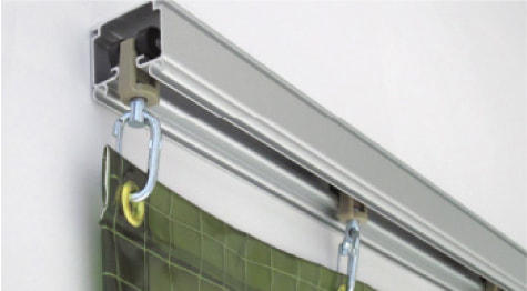 大型アルミレール/大型特殊ランナー(ハトメと同数)/ハトメ(メッキ)200mmピッチに1ヶ/シート縁取り(4辺)/エンドストッパー(2個)/下部チェーン(ステンレス)